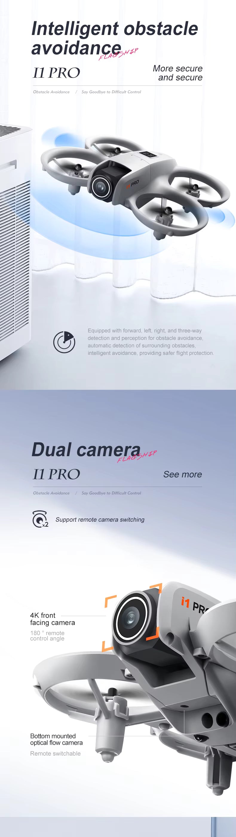 • Optical-flow positioning for steady hover • Dual HD cameras for clear aerial shots • LED propeller guards for night visibility • 6-axis gyro for stable control • One-key takeoff and landing • Headless mode and altitude hold • 360° flips and rolls • Adjustable speed modes • Rechargeable battery with USB charging