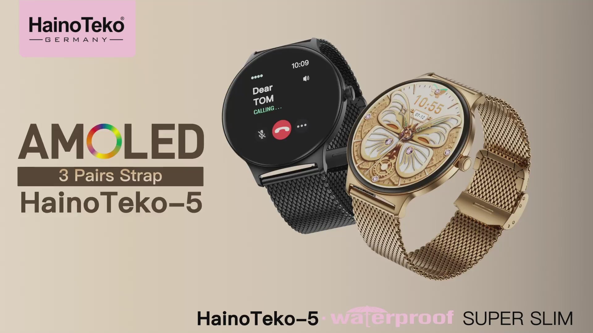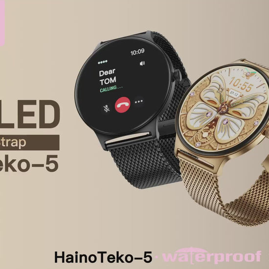 Experience elegance and intelligence with the Haino Teko 5 Smart Watch for women featuring a round AMOLED display, AI voice assistant, waterproof design, and 3 premium gold straps for every look.